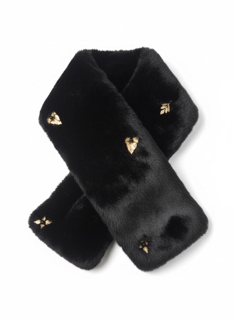 Noir Forest Scarf, a signature ADIBA piece crafted for those who appreciate artistry in every detail. This ultra-soft faux fur scarf captures the depth and richness of a midnight forest, brought to life with hand-beaded gold leaves and luminous glass beads that glimmer like light filtering through dark branches.