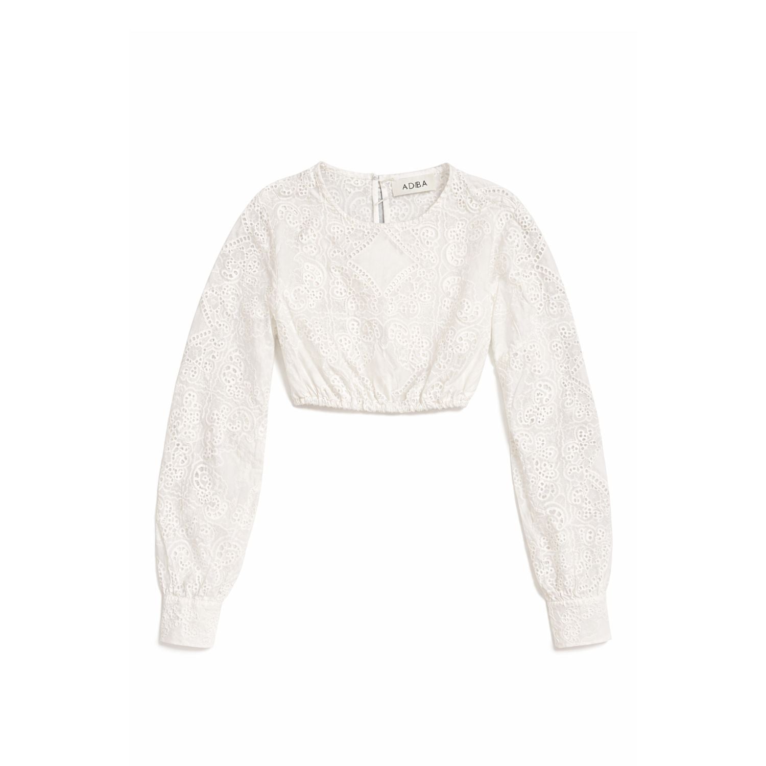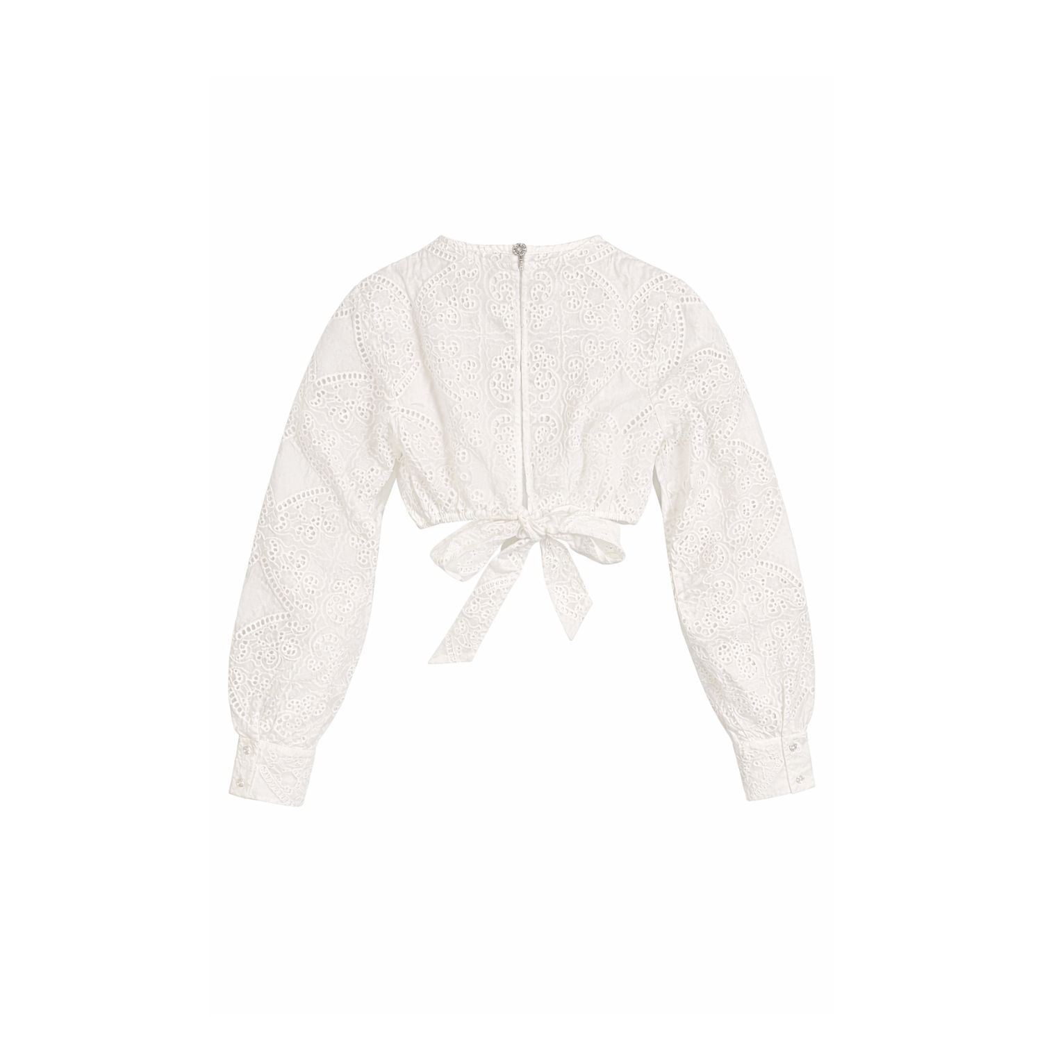 The cropped top is beautifully structured with a flattering front band that cinches the silhouette, while handmade rhinestone buttons add a subtle touch of sparkle and luxury. At the back, a refined open slit reveals just the right hint of skin, finished with a soft bow tie closure for an effortlessly graceful look.