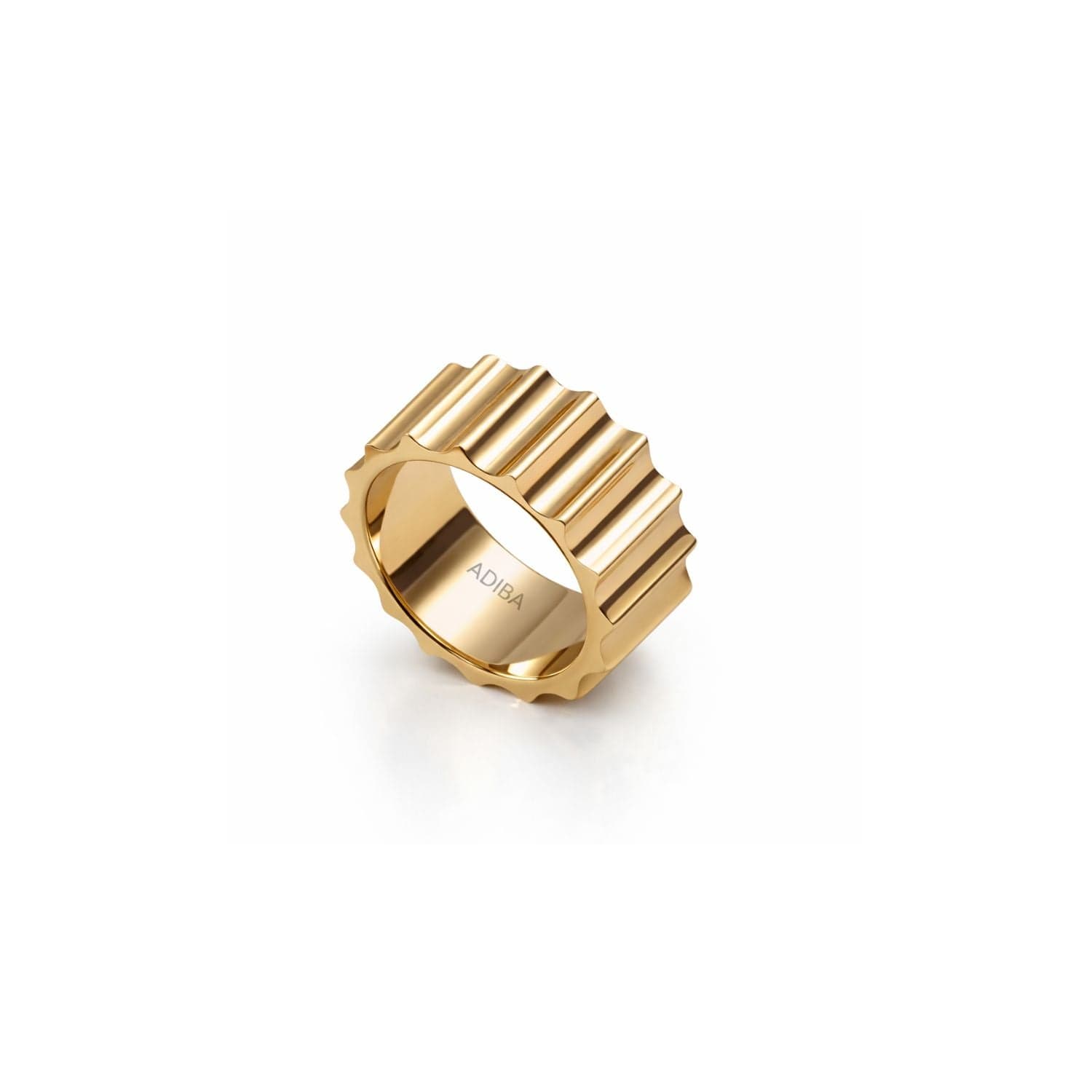 The Machina Gear Band Ring, a striking piece crafted from high-quality stainless steel. This ring features a distinctive gear-shaped design, combining industrial aesthetics with modern sophistication to create a unique accessory that stands out.
